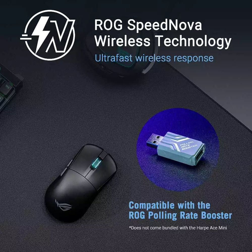 The ROG Harpe Ace Mini is an ultralight 49-gram semi-symmetrical gaming mouse with a shape approved by pro FPS players. Equipped with 42,000-dpi ROG AimPoint Pro optical sensor and ROG Optical Micro Switches, the ROG Harpe Ace Mini displays industry-leading wireless performance with SpeedNova wireless technology and supports up to 8,000 Hz wireless polling rate (compatible with the ROG Polling Rate Booster).